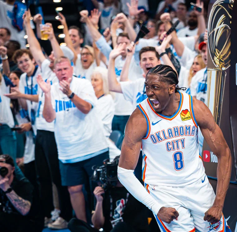Jalen Williams, del Thunder, celebra ante su público en Oklahoma, durante la final de la…